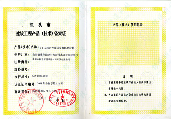 包頭市建設(shè)工程產(chǎn)品(技術(shù))備案證 產(chǎn)品(技術(shù))名稱:YT無(wú)機(jī)活性墻體保溫隔熱材料 生產(chǎn)廠家:南陽(yáng)銀通節(jié)能建材高新技術(shù)開發(fā)有限公司 南陽(yáng)市銀達(dá)新型墻體材料開發(fā)有限公司 執(zhí)行標(biāo)準(zhǔn):Q/YT004-2008 認(rèn)證證書編號(hào):2011年備材字第031號(hào) 有效期:截至到2013年6月8日 包頭市建設(shè)工程產(chǎn)品(技術(shù))備案專用章 2011年6月8日 產(chǎn)品(技術(shù))使用記錄 說(shuō)明:1.本備案證書是建設(shè)產(chǎn)品進(jìn)入包頭市建設(shè)市場(chǎng)唯一憑證。 2.各備案的產(chǎn)品生產(chǎn)企業(yè)應(yīng)當(dāng)按規(guī)定接受發(fā)證機(jī)關(guān)的檢驗(yàn)。