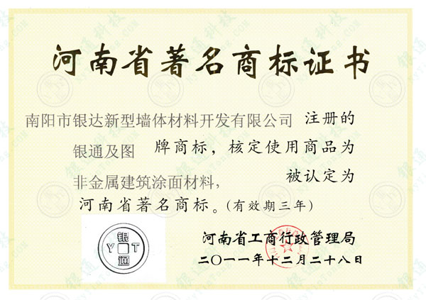 注: 此證書有效期三年,目前已失效,本介紹頁僅為方便用戶了解企業(yè)歷史資質(zhì),望悉知 河南省著名商標(biāo)證書 南陽市銀達(dá)新型墻體材料開發(fā)有限公司 注冊的銀通及圖(銀通·YT)牌商標(biāo),核定使用商品為非金屬建筑涂面材料,被認(rèn)定為河南省著名商標(biāo)。(有效期三年) 河南省工商行政管理局 二〇一一年十二月二十八日