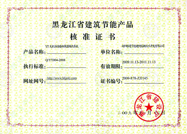 此證書為歷年曾獲證書,本介紹頁僅為方便用戶了解查詢企業(yè)歷史資質(zhì),望悉知 黑龍江省建筑節(jié)能產(chǎn)品核準證書 有效期限:2009.11.13-2011-11.13