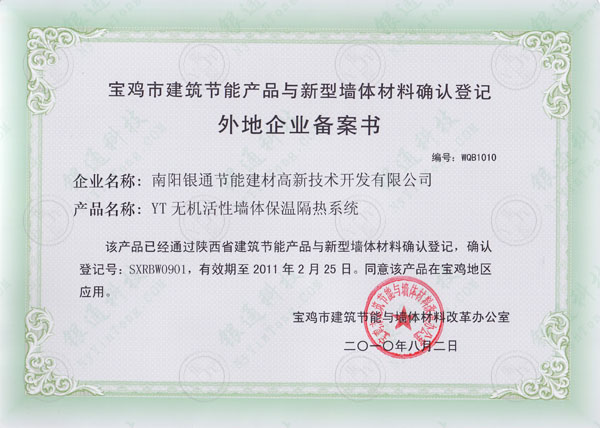 寶雞市建筑節能產品與新型墻體材料確認登記外地企業備案書 編號 NQB1010 企業名稱南陽銀通節能建材高新技術開發有限公司 產品名稱 YT無機活性墻體保溫隔熱系統 該產品已經通過陜西省建筑節能產品與新型墻體材料確認登記,確認登記號:SXRBW0901,有效期至2011年2月25日,同意該產品在寶雞地區應用 寶雞市建筑節能與墻體材料改革辦公室 2010年8月2日 寶雞市建筑節能產品與新型墻體材料備案證