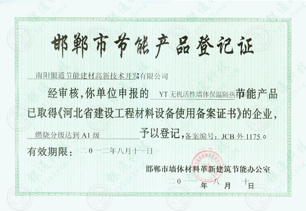 河北邯鄲市節能產品登記證 南陽銀通節能建材高新技術開發有限公司 南陽市銀達新型墻體材料開發有限公司 經審查你單位申報的YT無機活性墻體保溫系統節能產品已取得河北省建設工程材料設備使用備案證書的企業 燃燒等級達到A1級 予以登記 備案編號 JCB外1175號 有效期限2012年8月11日 邯鄲市墻體材料革新建筑節能辦公室 2011年8月10日