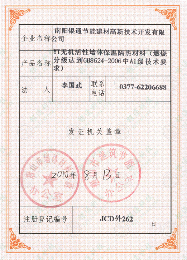 河北省唐山市建筑工程材料進(jìn)市登記證書 唐山市墻體材料革新辦公室 唐山市建筑節(jié)能辦公室  企業(yè)名稱南陽銀通節(jié)能建材高薪技術(shù)開發(fā)有限公司 產(chǎn)品名稱YT無機(jī)活性墻體保溫隔熱材料 燃燒分級(jí)達(dá)到GB8624-2006中A1級(jí)技術(shù)要求 發(fā)證機(jī)關(guān) 唐山市墻體材料革新辦公室 唐山市建筑節(jié)能辦公室 注冊(cè)登記編號(hào) JCD外262