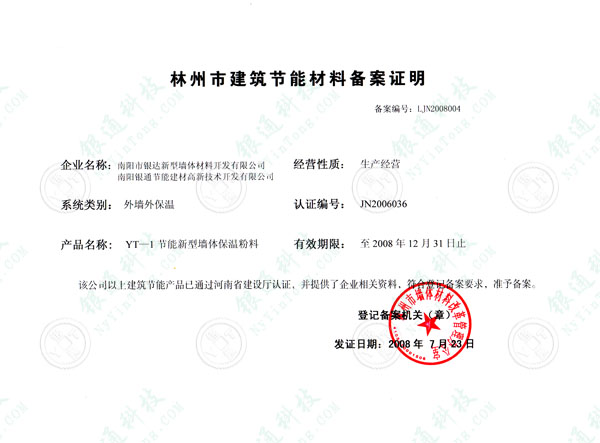 河南省林州市建筑節(jié)能材料備案證明 備案編號(hào)LJN2008004 企業(yè)名稱(chēng)南陽(yáng)銀通節(jié)能建材高新技術(shù)開(kāi)發(fā)有限公司 南陽(yáng)市銀達(dá)新型墻體材料開(kāi)發(fā)有限公司 產(chǎn)品名稱(chēng)YT-1節(jié)能新型墻體保溫粉料YT無(wú)機(jī)活性墻體保溫隔熱系統(tǒng) 系統(tǒng)類(lèi)別外墻外保溫 規(guī)格型號(hào)YT-A 產(chǎn)品型號(hào)50kg/袋注冊(cè)商標(biāo)銀通 銀達(dá) 有效期限2008年12月31日 該公司以上建筑節(jié)能產(chǎn)品已通過(guò)河南省建設(shè)廳認(rèn)證 并提供了企業(yè)相關(guān)資料 符合登記備案要求 準(zhǔn)予備案 登記備案機(jī)關(guān) 林州市墻體材料改革管理辦公室 發(fā)證日期2008年7月23日