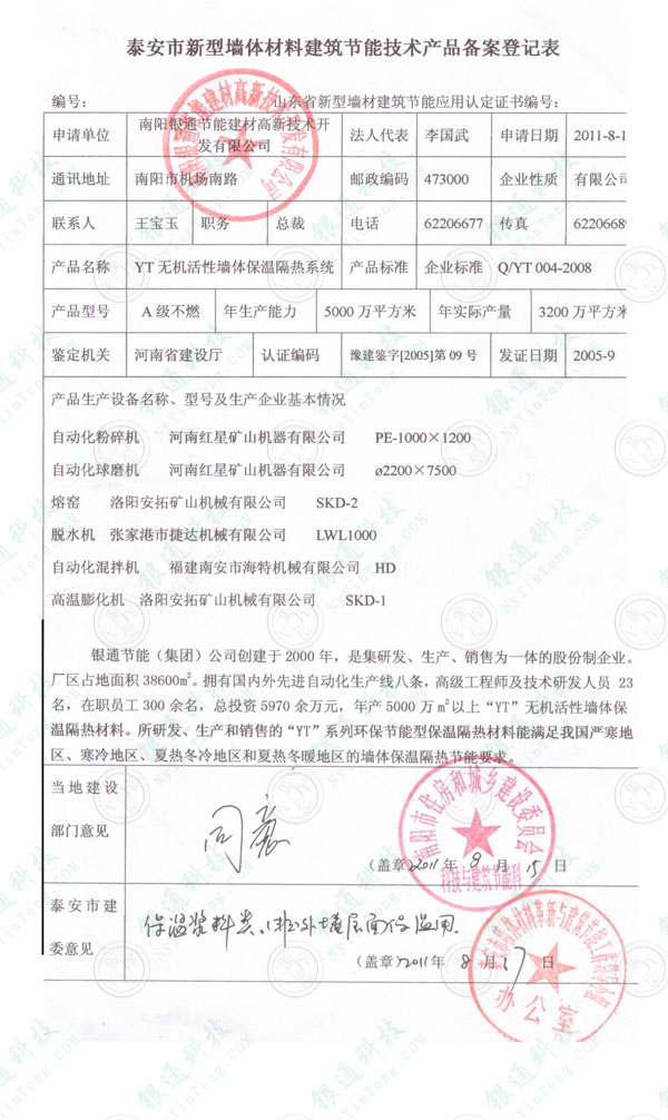 山東泰安市新型墻體材料建筑節能技術產品備案登記證 山東省新型墻材建筑節能應用認定證書 南陽銀通節能建材高新技術開發有限公司 你單位生產的yt無機活性墻體保溫隔熱系統 已經取得山東省新型墻材建筑節能技術產品認定證書 同意在我市建設工程保溫漿料中應用 當地建設部門意見 南陽市住房和城鄉建設委員會科技與建筑節能科 同意推廣應用 泰安市建委意見 保溫漿料類 外墻屋面保溫用 泰安市墻體材料革新與建筑節能工作領導小組辦公室 2011年8月17日