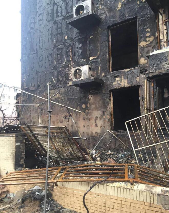 2月24日中午12點20分左右,北京市朝陽區安貞西里二區20號樓樓下西南角的一棚子起火。從圖片來看,這部分過火之處的外墻涂料和保溫系統的防護面層已經脫落,露出暗桔黃色的保溫材料,這種保溫材料在過火以后基本上碳化而沒有燃燒,但一樓的大部分板材在高溫、碳化、變形后脫落了。
