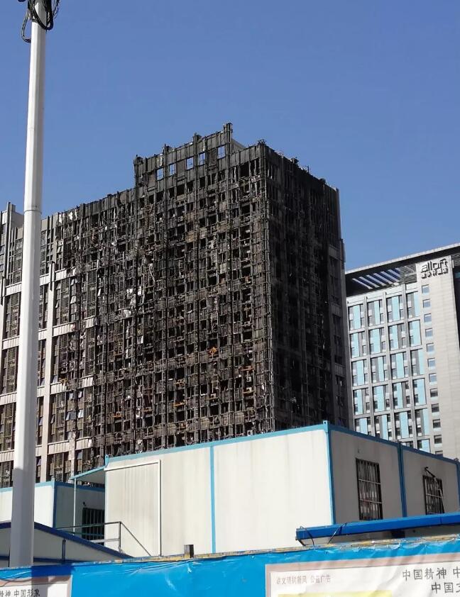 圖四、鄭州綠地原盛國際辦公樓著火后熱塑性擠塑板灰飛煙滅