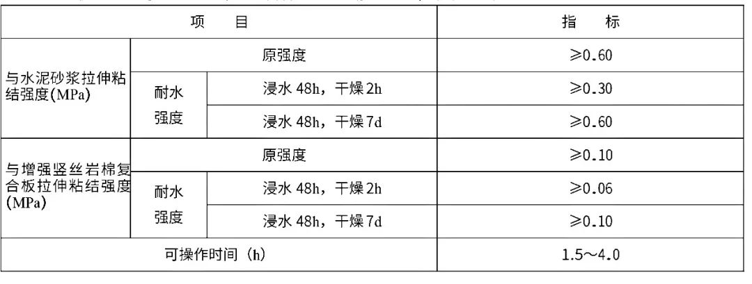 2023 版中增加了粘貼增強(qiáng)豎絲巖棉復(fù)合板用膠粘劑,性能見下表: