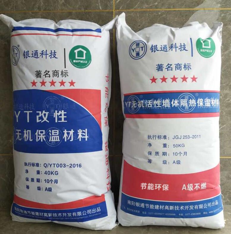 銀通YT無機保溫材料是以天然優質耐高溫輕質材料為骨料,天然植物蛋白纖維,優化組合多種無機改性材料和固化材料,經過工廠化生產配制,真正給客戶提供一個單組份成品,具有保溫、隔熱、防火、抗水、輕質、隔音、抗開裂、抗空鼓、抗脫落、使用壽命同墻體等性能,冬季可提高室內溫度6-10℃,夏季可降低室內溫度6-8℃,滿足國家75% 的節能要求。