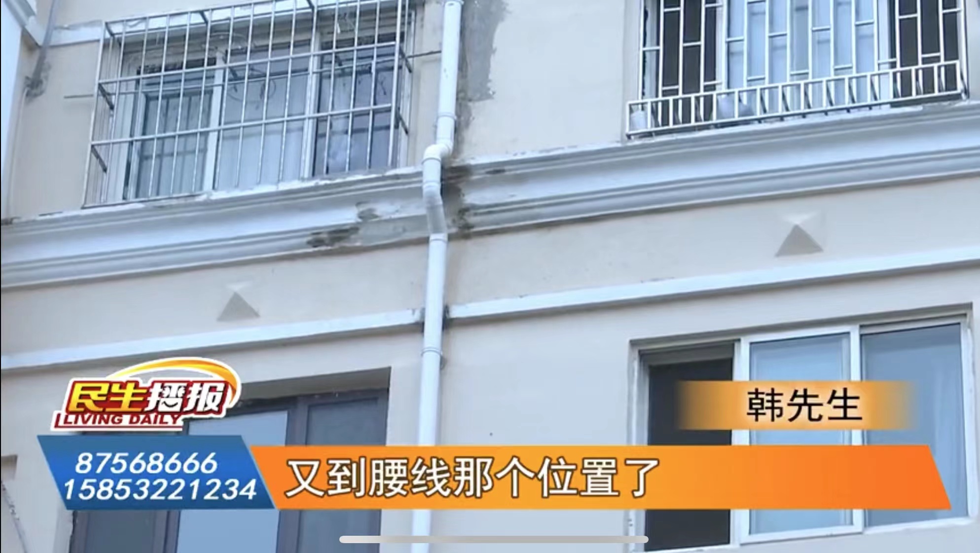 韓先生說外墻做保溫后會有夾層,裝飾腰線里積水后,水就會順著夾層滲入到屋里,從而導致家里漏水、墻皮長毛。他建議把腰線拆掉,但是拆腰線工程比較大,外墻保溫施工單位不會拆,物業也不會允許隨便拆除外墻裝飾腰線。