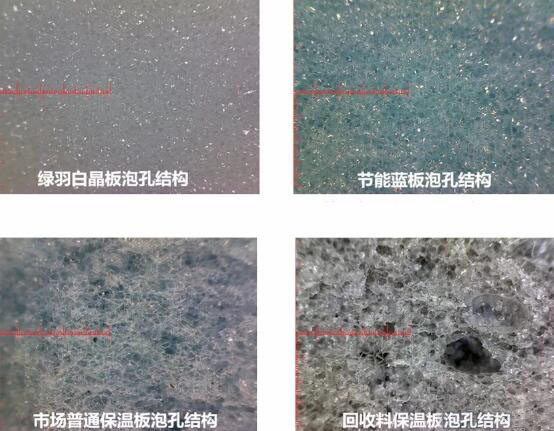 下面是四種擠塑板的微觀結構圖。白晶板的泡孔均勻且封閉。藍板泡孔封閉良好。黑板沒有泡孔基本沒有封閉。