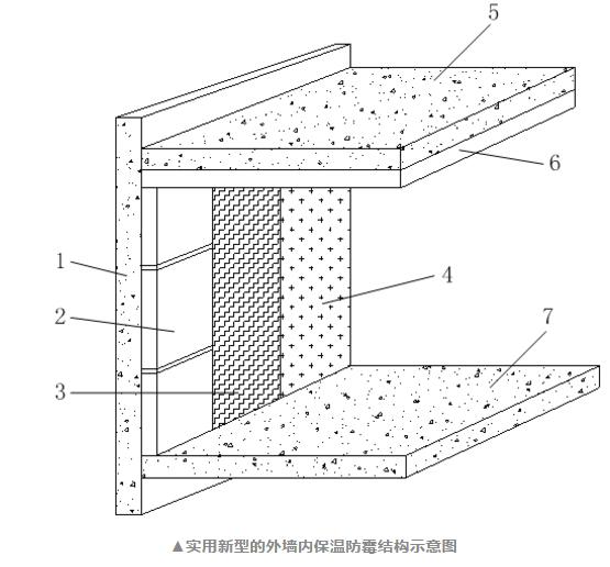1——外墻;2——第一保溫層;3——防水石膏板;4——裝飾面層;5——屋頂樓板;6——第二保溫層;7——地面樓板。