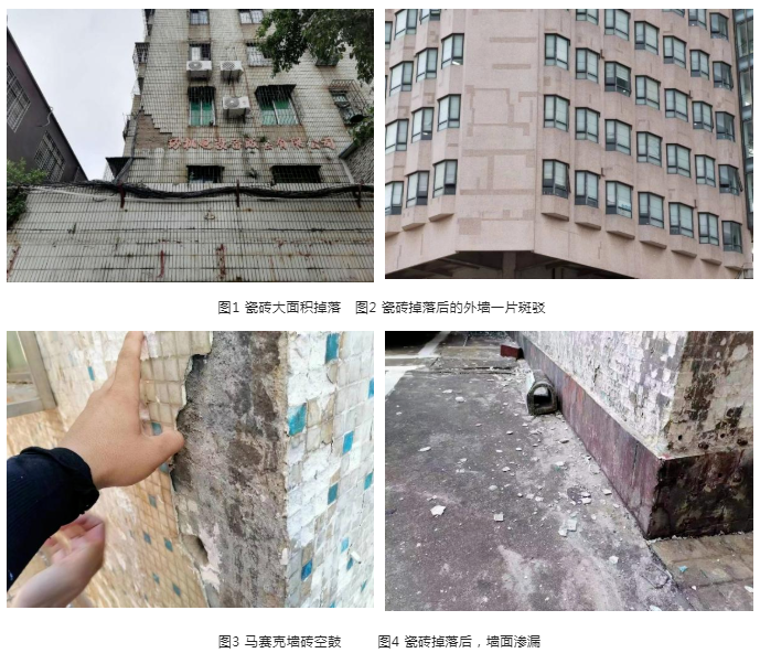 瓷磚脫落一方面有礙觀瞻,就像墻面得了 “牛皮癬”一樣,看上去特別不舒服;另外,瓷磚脫落容易砸傷行人和車輛,危及樓下行人的生命安全,給社會公共安全造成較大危害。此外,瓷磚脫落,時間長了會引發墻體開裂,造成室內墻體滲漏,墻面裝飾涂料或者墻紙發生起皮、脫落和霉變現象,給居民生活帶來諸多不便,而且維修起來費時費力費錢,成為不少居民的“心頭病”。圖1—4為海口市老小區外墻瓷磚空鼓、脫落情況。