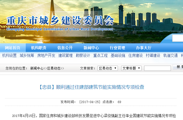 2017年4月15日,國家住房和城鄉(xiāng)建設(shè)部科技發(fā)展促進(jìn)中心梁俊強(qiáng)副主任率全國建筑節(jié)能實(shí)施情況專項(xiàng)檢查組一行前來我縣,對隨機(jī)抽取的玉溪錦城一期21號樓、中博香山湖八期中博.香山公館6號樓2個居住建筑項(xiàng)目和忠縣過夜港及旅游集散中心項(xiàng)目1個公共建筑項(xiàng)目進(jìn)行了建筑節(jié)能工程質(zhì)量專項(xiàng)檢查。市城鄉(xiāng)建委相關(guān)領(lǐng)導(dǎo)、縣相關(guān)領(lǐng)導(dǎo)和縣城鄉(xiāng)建委相關(guān)領(lǐng)導(dǎo)及科室負(fù)責(zé)人等隨行檢查。
