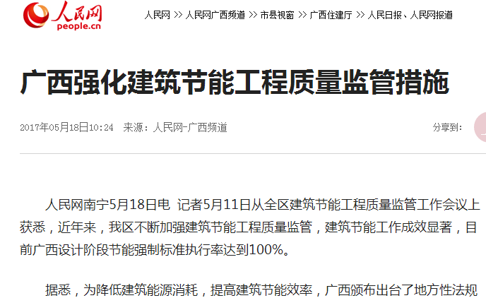 人民網南寧5月18日電  記者5月11日從全區建筑節能工程質量監管工作會議上獲悉,近年來,我區不斷加強建筑節能工程質量監管,建筑節能工作成效顯著,目前廣西設計階段節能強制標準執行率達到100%。